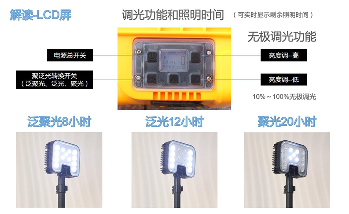 4、針對(duì)不同的照明模式,可手動(dòng)進(jìn)行10-100%的無(wú)極調(diào)光,同時(shí)可在LCD顯示屏上直觀的顯示剩余電量,預(yù)算可繼續(xù)工作時(shí)間。