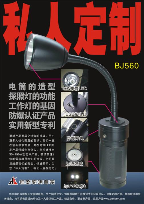 聯(lián)系人:劉經(jīng)理BJ560型多功能防爆工作燈實(shí)用性強(qiáng),10W國(guó)際頂級(jí)品牌LED亮度高,深照配光聚光型強(qiáng),照射距離遠(yuǎn),強(qiáng)磁吸附式吸力強(qiáng)解放雙手作業(yè),蛇桿燈頭結(jié)構(gòu)可萬向任意調(diào)節(jié)照明射方向,數(shù)碼充電功能可為你隨時(shí)隨解決手機(jī)等電子產(chǎn)品應(yīng)急充電功能,防爆結(jié)構(gòu)設(shè)計(jì)并已通過國(guó)家級(jí)防爆認(rèn)證,IP65的防護(hù)設(shè)計(jì)可在各種場(chǎng)合任意使用,經(jīng)典!!