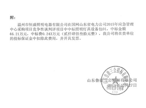 日前,市場又傳喜汛,在國網山東省電力公司2015年應急管理中心采購項目招標中中標照明設備包01。