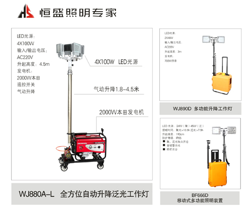 1、從上面上市產(chǎn)品列表不難發(fā)現(xiàn),2016新產(chǎn)品的特點除了LED外還是LED。比如LED款全方位自動升降泛光工作燈(WJ880A-L),LED車載遙控探照燈(WJ828D)這兩款產(chǎn)品傳統(tǒng)光源都是選用氙氣,鹵鎢燈,金鹵燈,鈉燈等光源。恒盛照明企業(yè)在LED應(yīng)用到爐火純青階段全部更新為LED光源。經(jīng)過現(xiàn)場測試,同等條件下LED光源完勝鹵鎢燈光源。