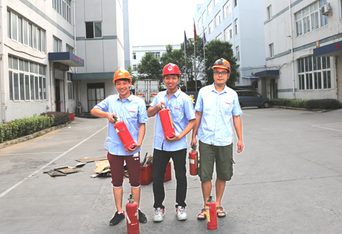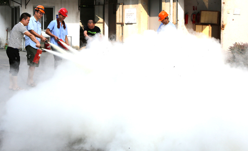 消防器材使用演練在公司大院舉行,洶洶的火焰燃起,勇敢的消防隊(duì)員沖進(jìn)火場(chǎng),拔出滅火器的保險(xiǎn),抽出插銷,壓下噴火嘴,干粉瞬間涌出,火苗就這樣悄無生息的滅了。