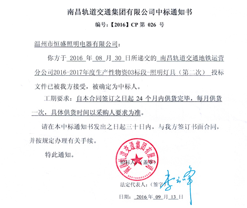 近日,通過各方努力,大家共同奮斗,恒盛照明企業(yè)接到南昌地鐵項(xiàng)目中標(biāo)通知書,獲得為期兩年的地鐵運(yùn)營燈具合約。全文如下: